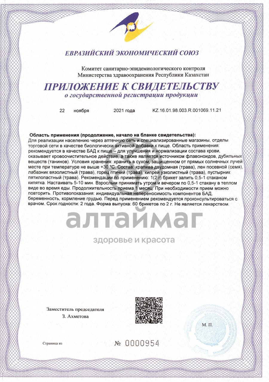 Крапива содержит максимальное для местных растений количество хлорофилла, формула которого напоминает формулу гемоглобина крови. По современным данным хлорофилл оказывает мощное гемостимулирующее действие. Спорыш, благодаря легкому желчегонному и мочегонному эффектам, улучшает функции печени и почек, способствует удалению токсических веществ из организма, опосредованно способствуя нормализации состава крови. Крушина усиливает активность пищеварительного тракта, что также способствует выведению токсических веществ из организма, опосредованно способствуя нормализации состава крови. Лабазник и кипрей улучшает микроциркуляцию крови, на уровне которой осуществляются основные обменные процессы в тканях. пустырник в вечернем сборе обеспечивает седативный эффект.