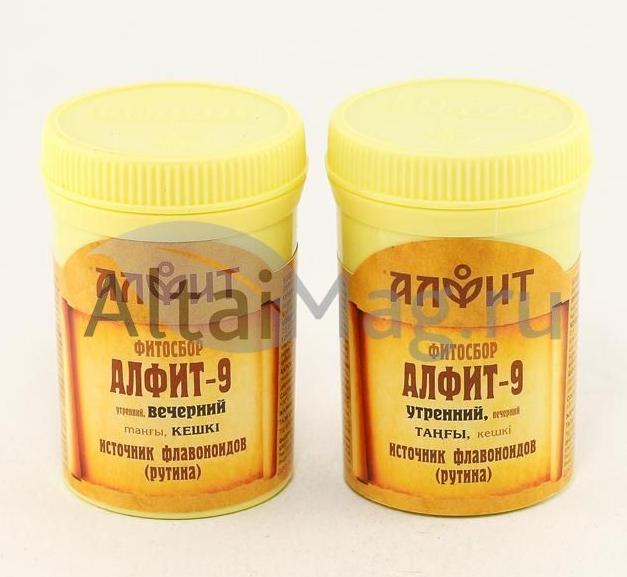 Алфит-9 утренний: пион уклоняющийся, душица обыкновенная, зизифора клиноподиевидная, горец птичий (спорыш), копеечник чайный (красный корень). Алфит-9 вечерний: пион уклоняющийся, душица обыкновенная, зизифора клиноподиевидная, горец птичий (спорыш), копеечник чайный (красный корень), пустырник пятилопастный.