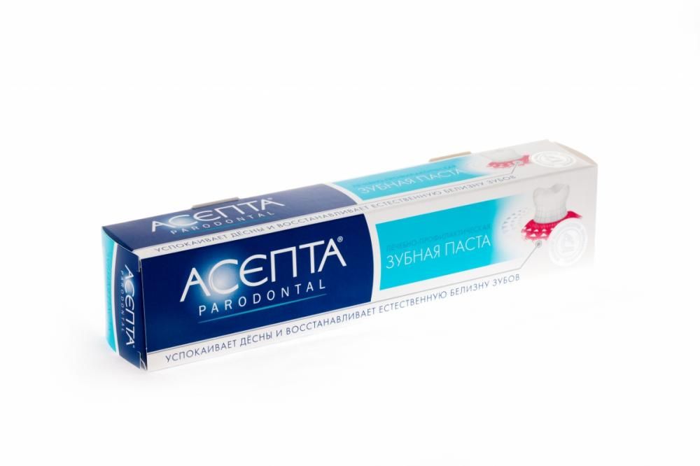Лечебно-профилактическая зубная паста АСЕПТА® предназначен для комплексного ухода за полостью рта и защиты десен от воспаления. Лечебно-профилактическая зубная паста "Асепта" — продукт для гигиены ротовой полости, оказывающий противовоспалительный эффект. "Асепта" бережно и эффективно удаляет зубной налет, обеспечивает гигиену полости рта, оказывает противокариесное и противовоспалительное действие, придает свежесть дыханию.