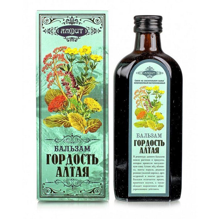 Бальзам Гордость Алтая выпускается в стеклянном флаконе объемом 250 мл. Флакон упакован в красивую, художественно оформленную картонную коробку. Гарантируем - этот бальзам не только позитивно скажется на вашем здоровье, но и доставит эстетическое удовольствие во время употребления.РЕКОМЕНДАЦИИ ПО ПРИМЕНЕНИЮ: