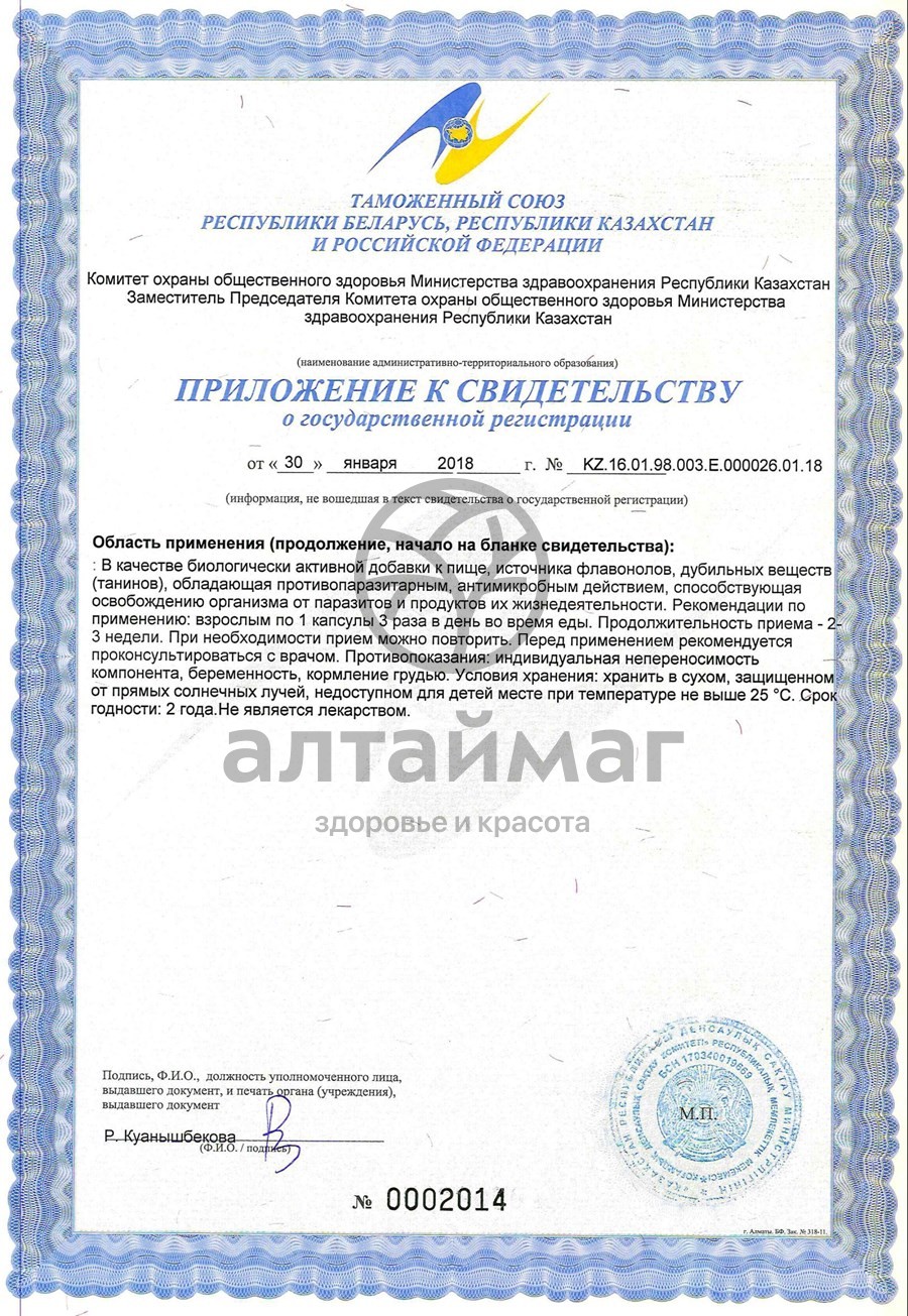 Дополнительный источник флавонолов, дубильных веществ. Фитосбор в капсулах антипаразитарный способствует освобождению организма от паразитов и продуктов их жизнедеятельности, уничтожает инвазионные глистные яйца, нормализует микрофлору кишечника и уничтожает бактерии. Обладает противопаразитарным и антимикробным действием. Рекомендуется в программах очищения организма.
