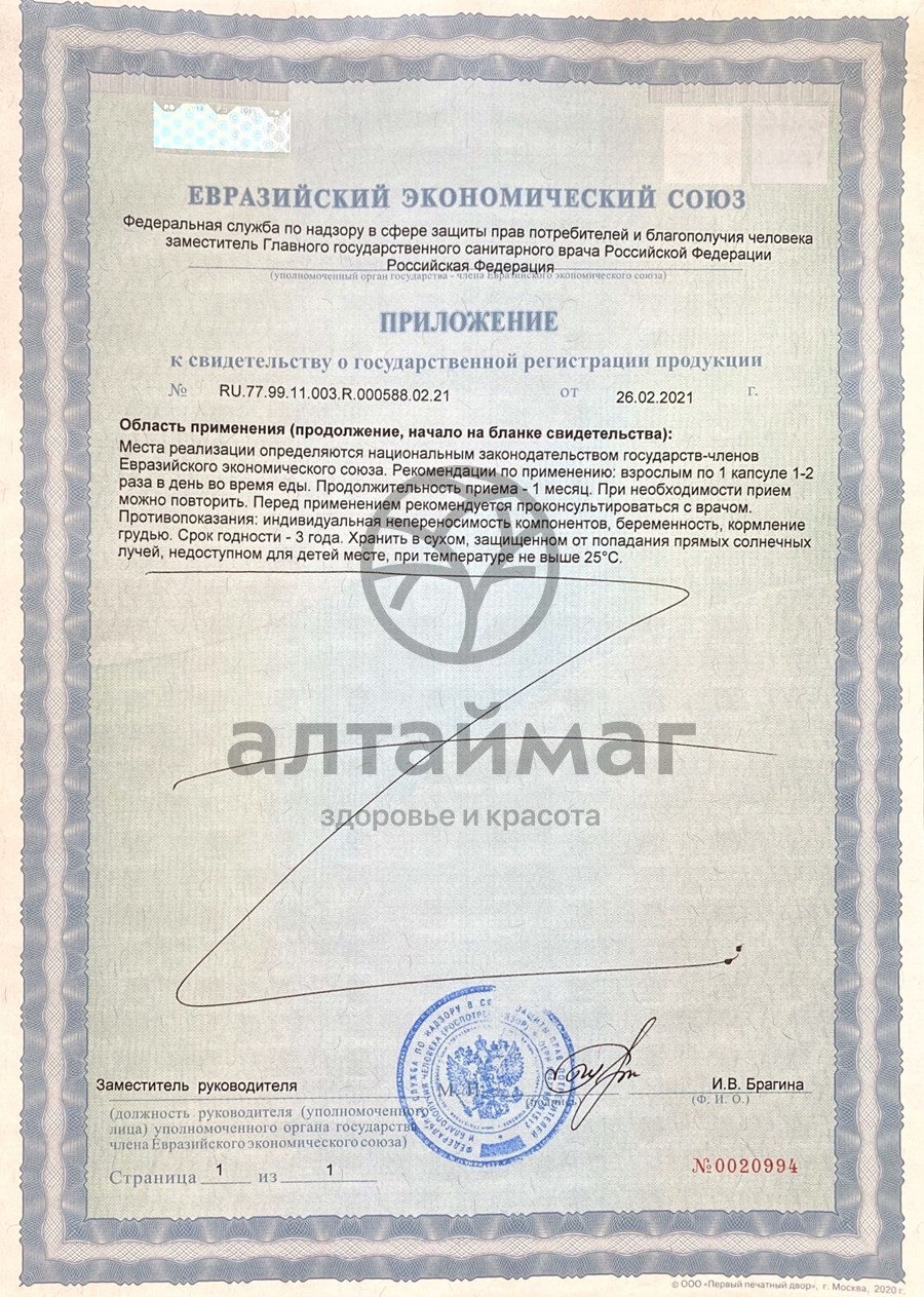 Рекомендации по применению: взрослым принимать по 1 капсуле 1-2 раза в день во время еды. Продолжительность приема – 1 месяц.