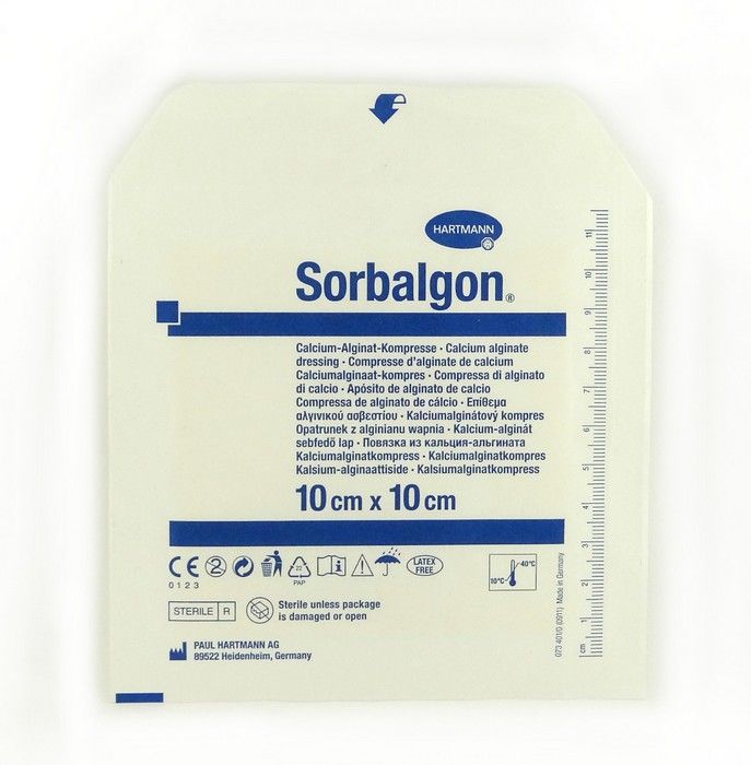 Тампонируемая в рану повязка SORBALGON из волокон кальция-альгината, которая, реагируя с солями натрия в крови и секрете, превращается в гидрофильный гель, заполняющий рану и не приклеивающийся к ней, способствует заживлению микросреды, для экссудирующих и кровоточащих ран, при трофических и диабетических язвах, пролежнях, абсцессах, фурункулах, а также для труднообрабатываемых ран в неотложной и онкохирургии. Размер повязки: 10 х 10 см.