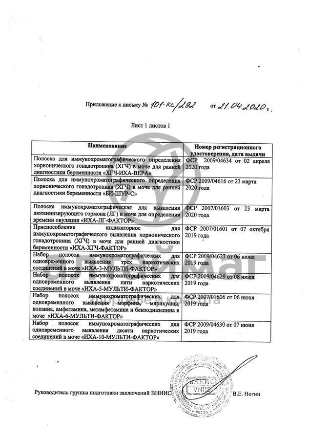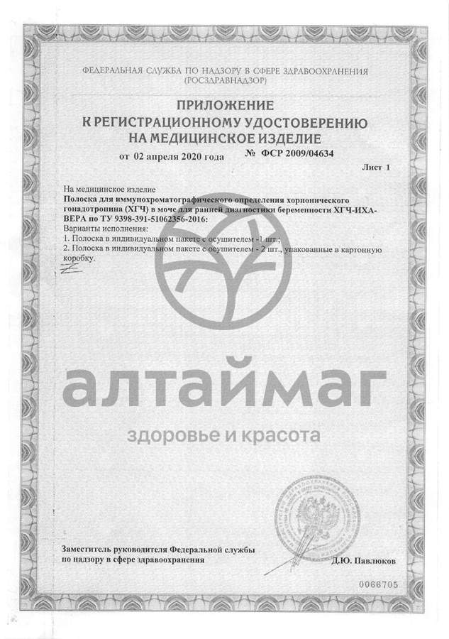 Полоска ХГЧ-ИХА-ВЕРА предназначена для быстрого одностадийного качественного in vitro определения хорионического гонадотропина человека (ХГЧ) в моче методом иммунохроматографического анализа для выявления беременности на ранних сроках.Форма выпуска теста на беременность